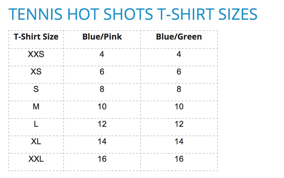 The shirt sizes for Hot Shots are outlined below.
